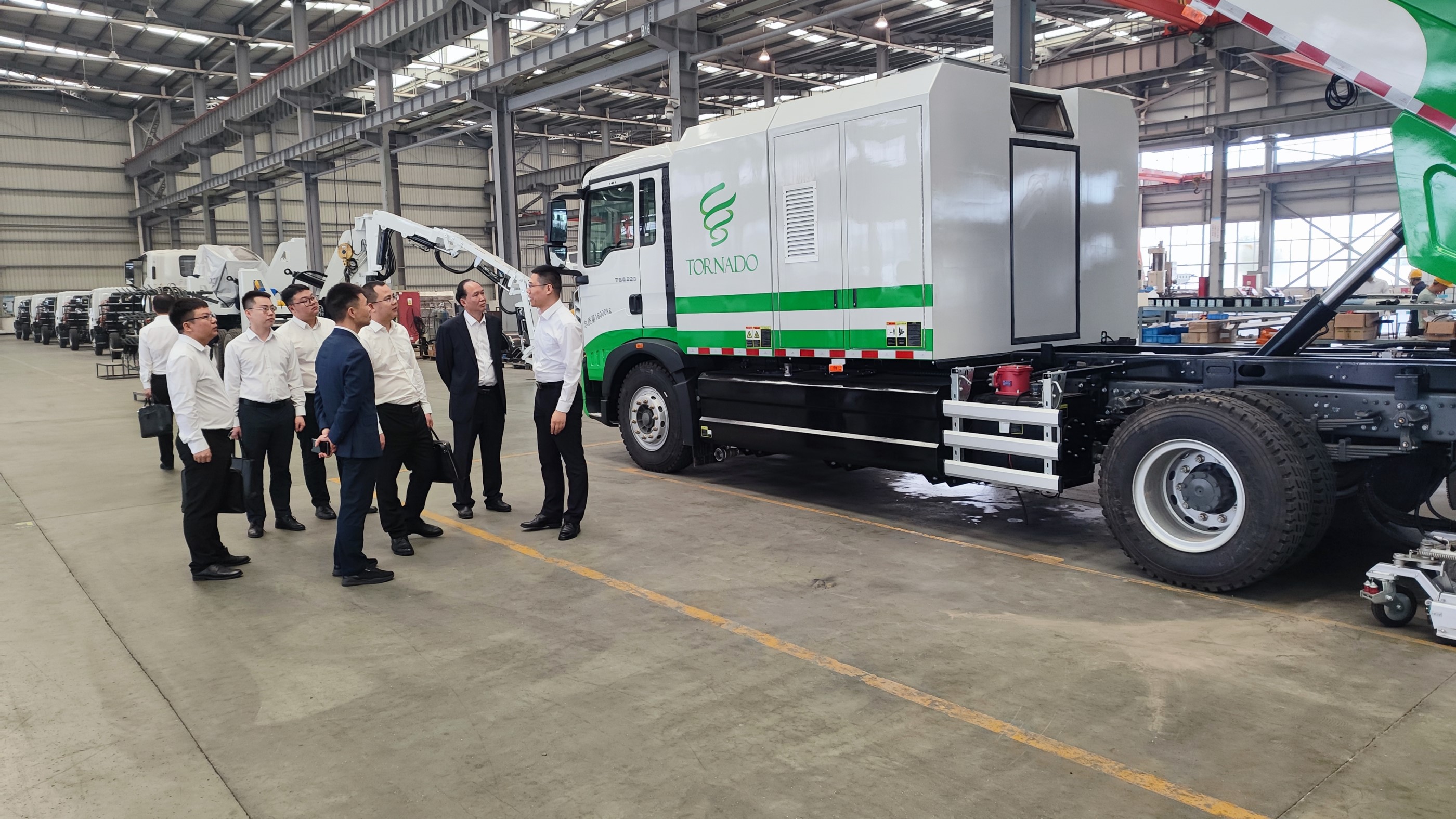 4月12日,北控城市環(huán)境服務(wù)集團有限公司(以下簡稱“北控城市服務(wù)”)董事長趙克喜、總裁助理兼華南區(qū)域總經(jīng)理甘勝平、華南區(qū)域執(zhí)行總經(jīng)理李真一行蒞領(lǐng)海山機械考察交流。海山機械董事長林愛萍、總經(jīng)理閆炳雷等公司領(lǐng)導(dǎo)陪同趙克喜董事長一行參觀了公司成果展示及生產(chǎn)車間,觀看了道路污染清除車和挖掘抽吸車現(xiàn)場演示,趙克喜董事長對海山機械的產(chǎn)品功能、應(yīng)用場景及作業(yè)效果給予了高度評價。