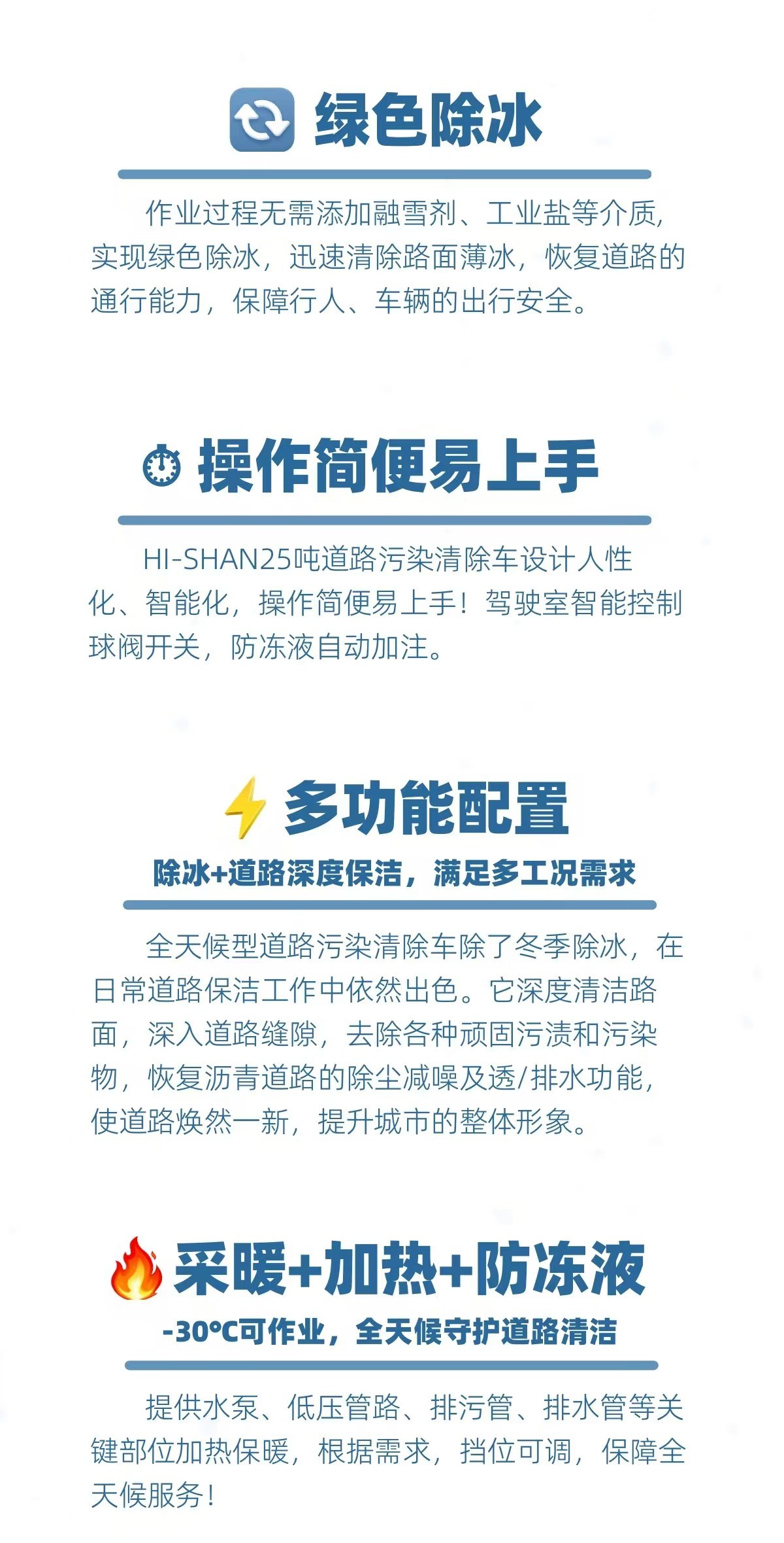 ??????? 冬季的寒風(fēng)漸起,城市的面貌在皚皚白雪的映襯下顯得尤為清新,同時(shí)也給環(huán)衛(wèi)工作帶來了挑戰(zhàn)。海山自2017年推出了25噸除冰型道路污染清除車,無畏瓶頸,技術(shù)不斷迭代,無畏寒冬,行駛在一個(gè)個(gè)北風(fēng)凜冽的城市里,為環(huán)衛(wèi)工作注入了新的動(dòng)力,更為城市的冬季清潔工作開辟了新的高效路徑。