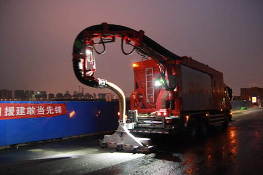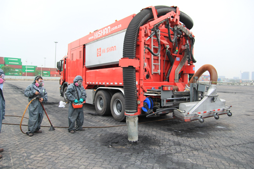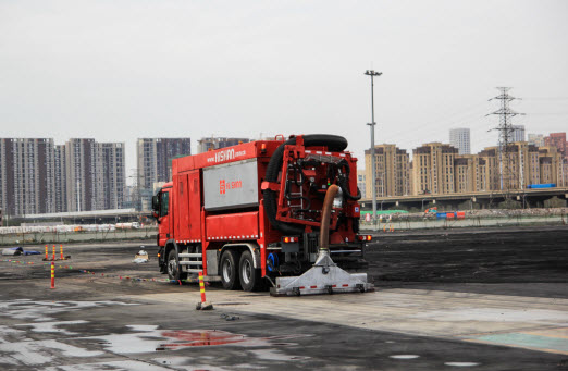 本次施工改變了傳統(tǒng)的由清掃車清掃作業(yè)、灑水車高壓沖洗、多種洗消設(shè)備聯(lián)合作業(yè)的施工模式,由一臺抽吸車即可完成,對污染物的清除率達到現(xiàn)場的環(huán)保施工要求。相對于傳統(tǒng)的作業(yè)方式,全密閉、無拋灑、地表清洗干凈,工作效率提升5倍以上。