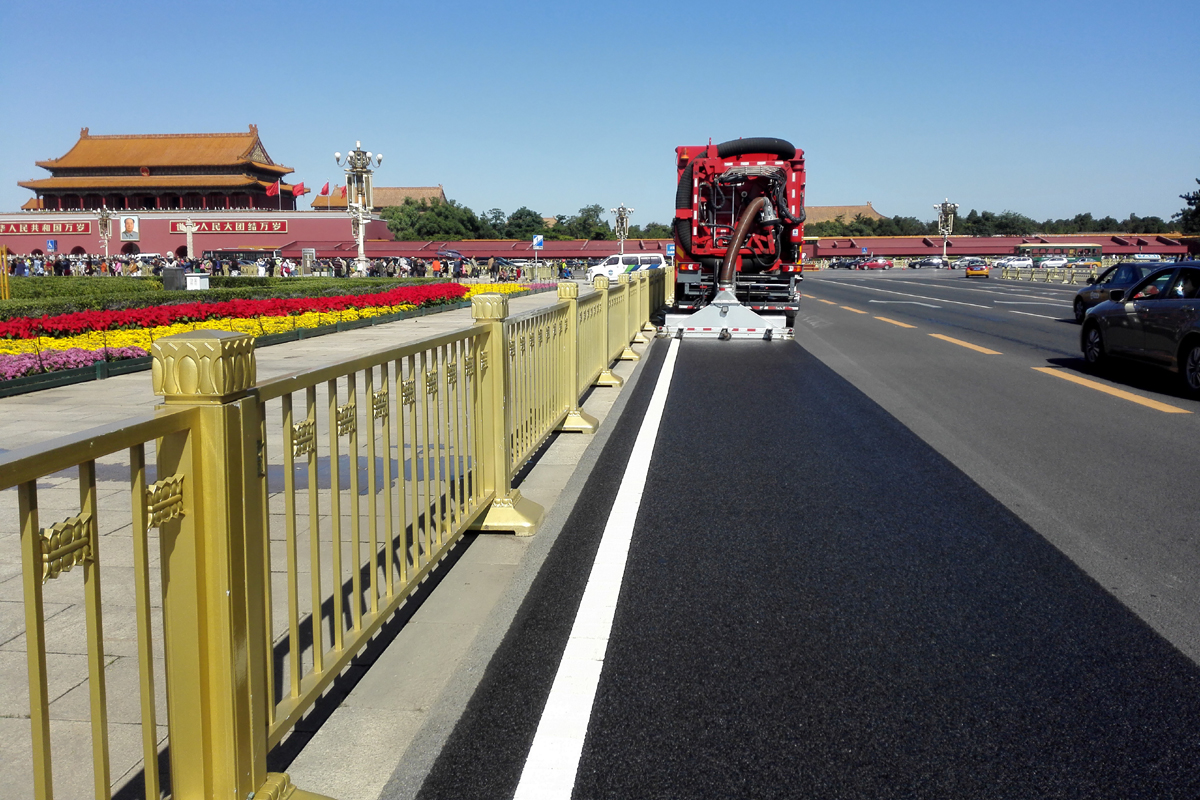 北京市天安門廣場、二環(huán)線、三環(huán)線、長安街等主干道路面的深度清潔施工,經(jīng)過清理的路面顯露出了路面鋪設(shè)之初的本色,縫隙可見,標(biāo)線清晰,與只經(jīng)過普通機(jī)掃的路面形成鮮明對比,此次大范圍清潔之后,使得城區(qū)主干道更干凈,還北京一片藍(lán)天。